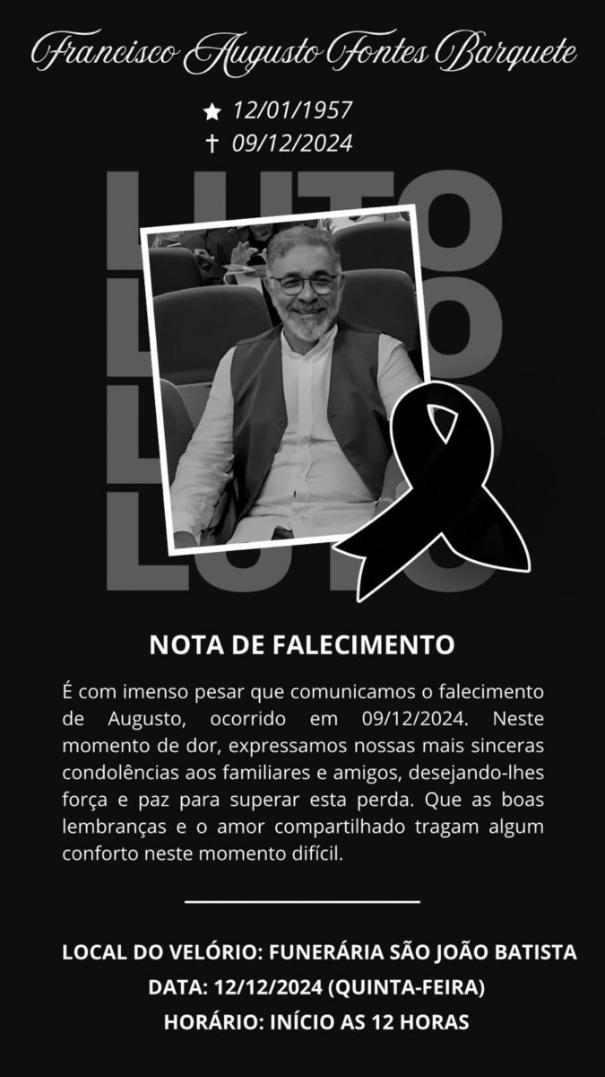 Foi comunicado o falecimento de Francisco Augusto Fontes Barquete, ocorrido no dia 9 de dezembro de 2024. A nota de falecimento expressa pesar e solidariedade aos familiares e amigos, destacando o desejo de força e paz para enfrentarem este momento de luto.