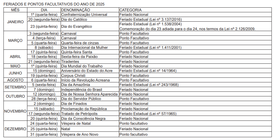 Na edição do Diário Oficial do Estado (DOE) desta sexta-feira (20) o Governo definiu todos os feriados e pontos facultativos de 2025. CONFIRA NA ÍNTEGRA!