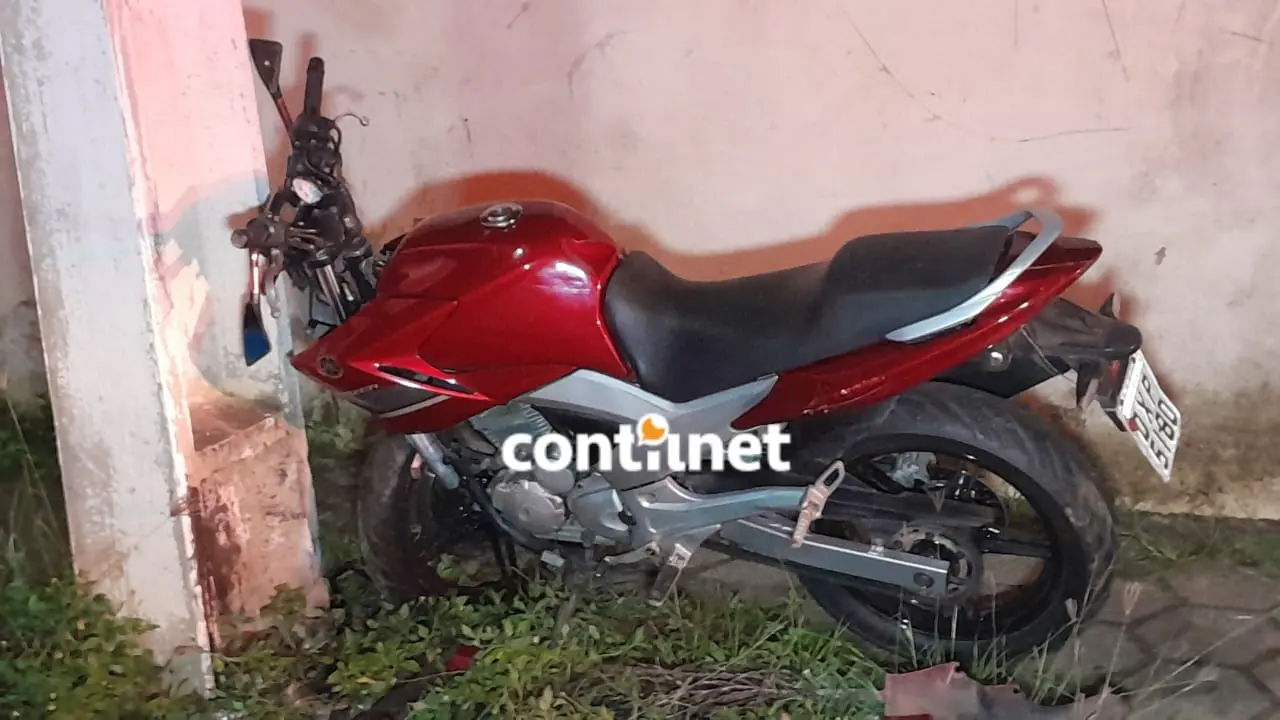 A motocicleta modelo Fazer, de cor vermelha, após colidir contra um poste na Rua José de Melo, no bairro do Bosque, deixando o motorista em estado grave/Foto: ContilNet
