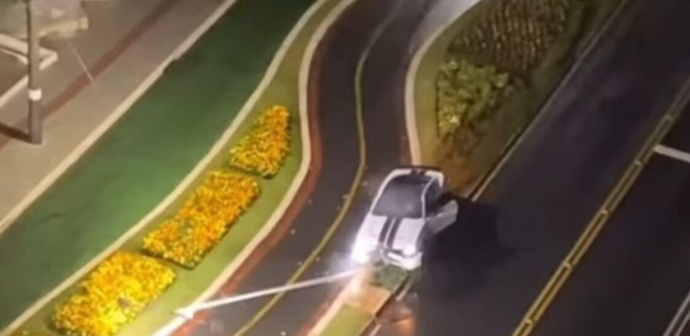 Um veículo Ford Mustang colidiu contra um poste de iluminação pública. O motorista deixou o local antes da chegada das autoridades.