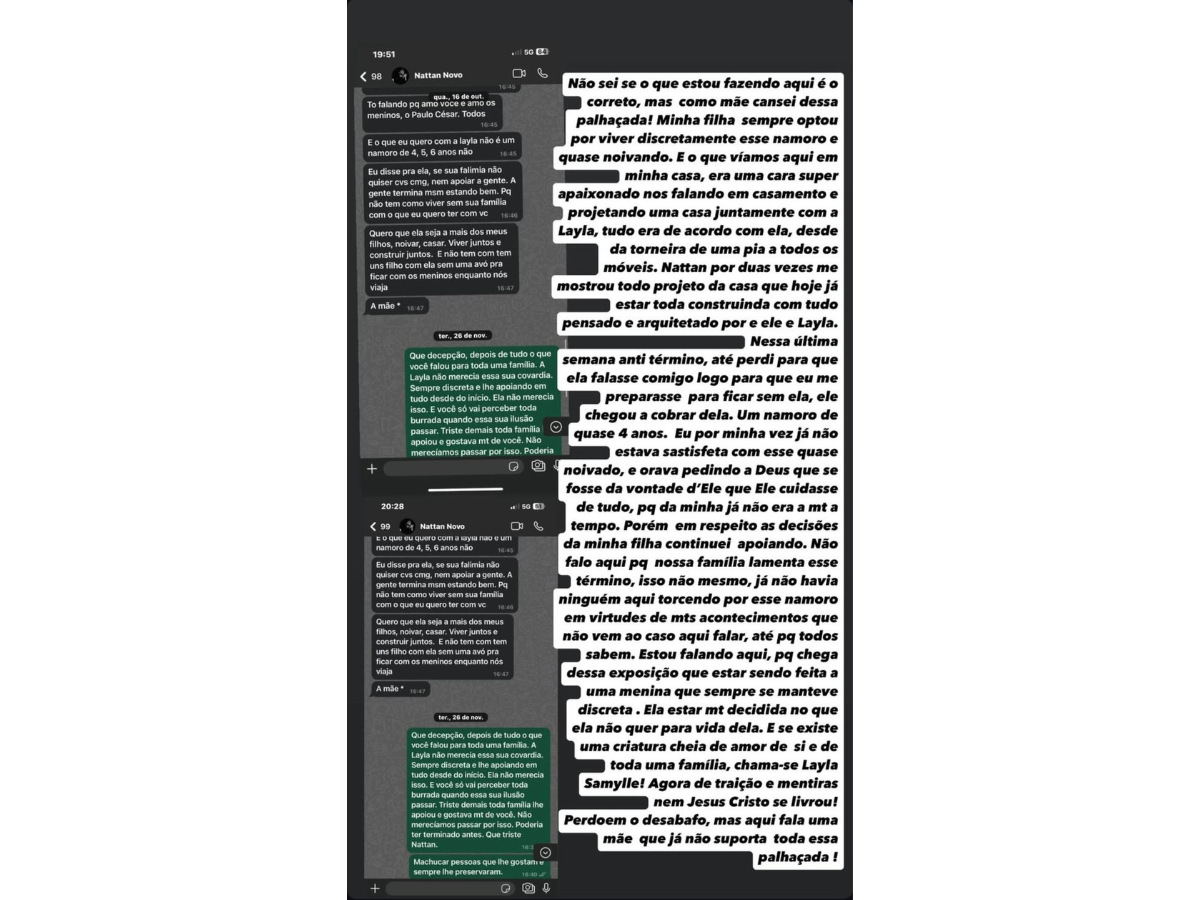 Em um print de conversa com Nattan e uma escrita por cima, a mãe de Layla desabafou que “cansou da palhaçada”: “O que víamos aqui em asa era um cara super apaixonado nos falando em casamento e projetando uma casa juntamente com a Layla (…) Eu por minha vez já não estava satisfeita com esse quase noivado”.