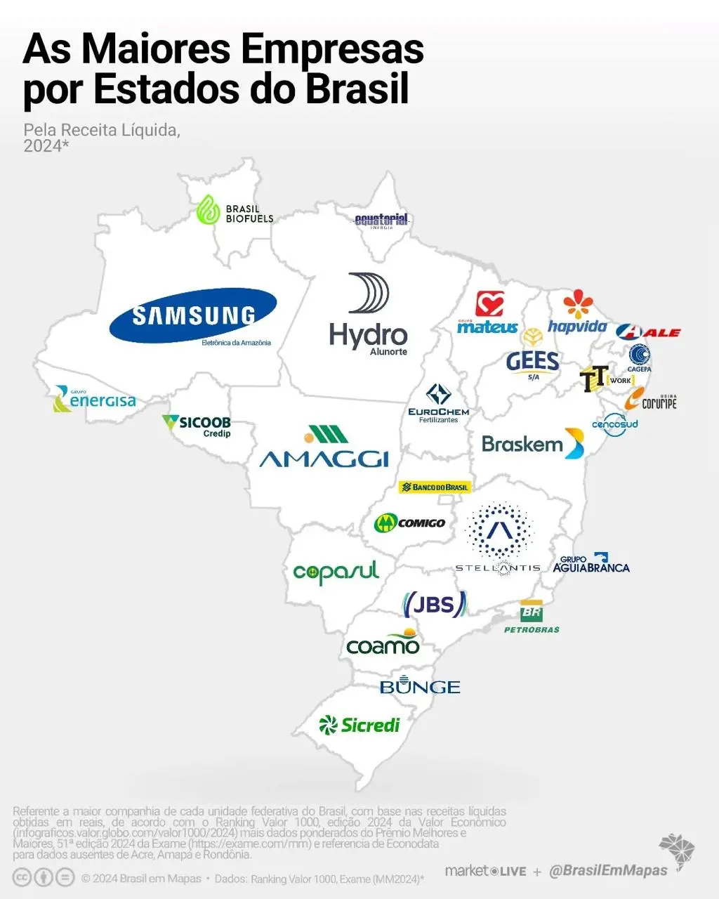 O Brasil em Mapas divulgou neste sábado (21), uma pesquisa sobre as maiores companhias por estado do Brasil, com base nas suas receitas líquidas obtidas em reais, em 2024.