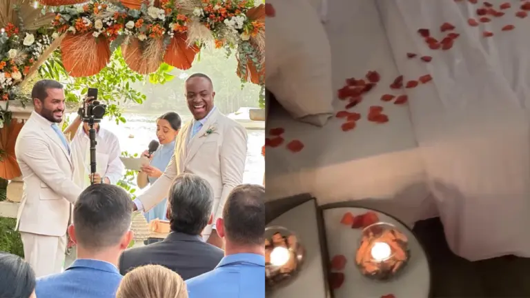 Após celebrarem sua união em uma cerimônia emocionante no último sábado (30), na Ilha da Gigóia, no Rio de Janeiro, o empresário acreano Rizo Araújo e o esteticista e comissário de bordo Erlando Warlem encerraram o dia com uma noite de núpcias inesquecível no Mercure Rio Boutique Hotel Copacabana. O empresário liberou as imagens do quarto preparado para a coluna Douglas Richer, do ContilNet.