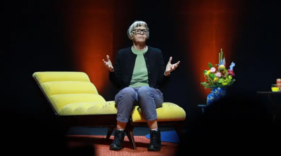 Em uma manhã quente em São Paulo, a psicoterapeuta britânica Philippa Perry sobe em um palco onde tem um divã amarelo, levando consigo um pequeno caderno Moleskine.