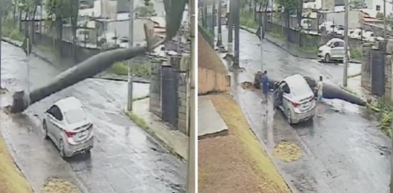 As imagens mostram o momento que a árvore cai e quase atinge um carro, que estava com duas pessoas dentro. O motorista e a passageira tinham acabado de entrar no veículo quando a palmeira desabou, poucos metros a frente.