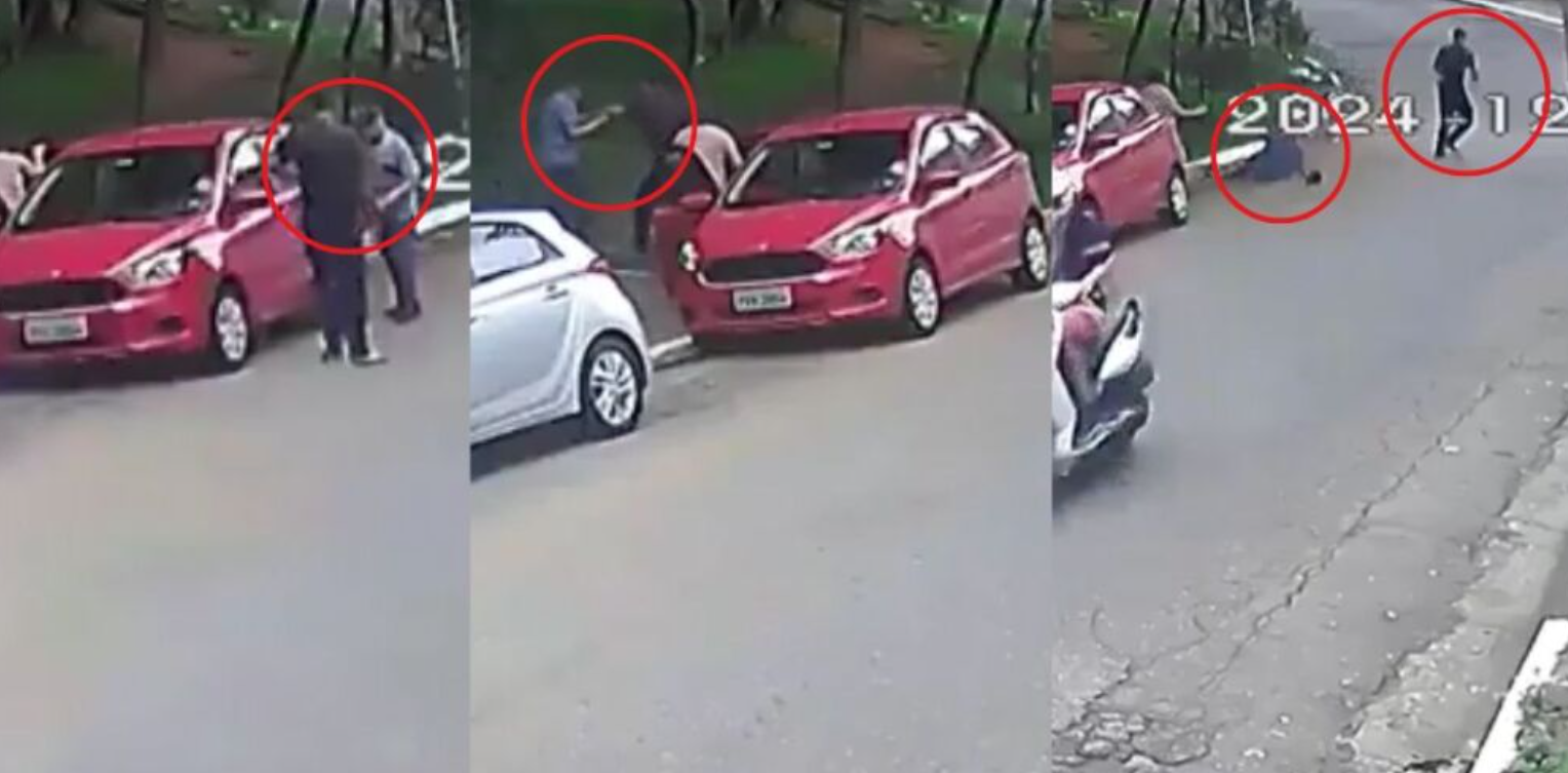 Nas imagens, é possível ver a família caminhando por uma praça, em direção ao carro estacionado, quando um homem de preto se aproxima e diz algo. O idoso dá a volta no carro, enquanto o homem corre atrás dele. Depois, o criminoso parece arrancar algo de uma das mulheres e dispara contra o idoso, que cai sobre o asfalto.