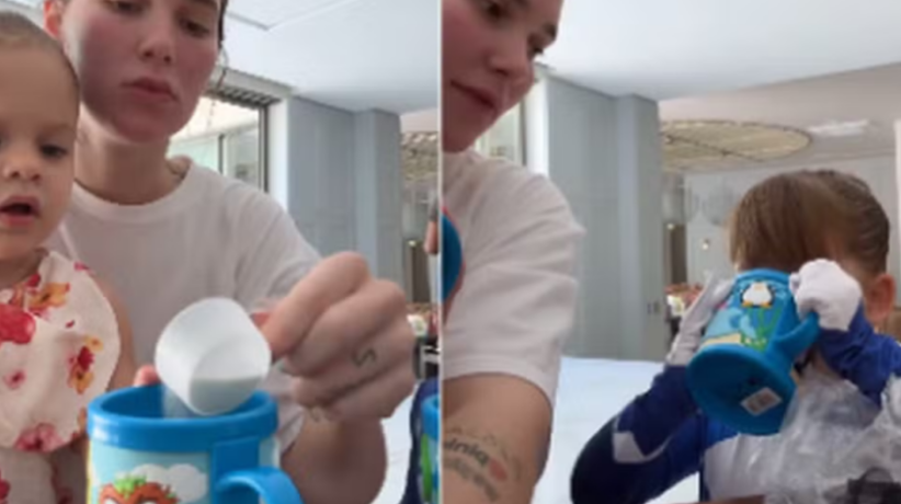 Em seguida, a influenciadora já apareceu com a filha no colo, enquanto segurava uma caneca e colocava a subtância nela para misturar com água.