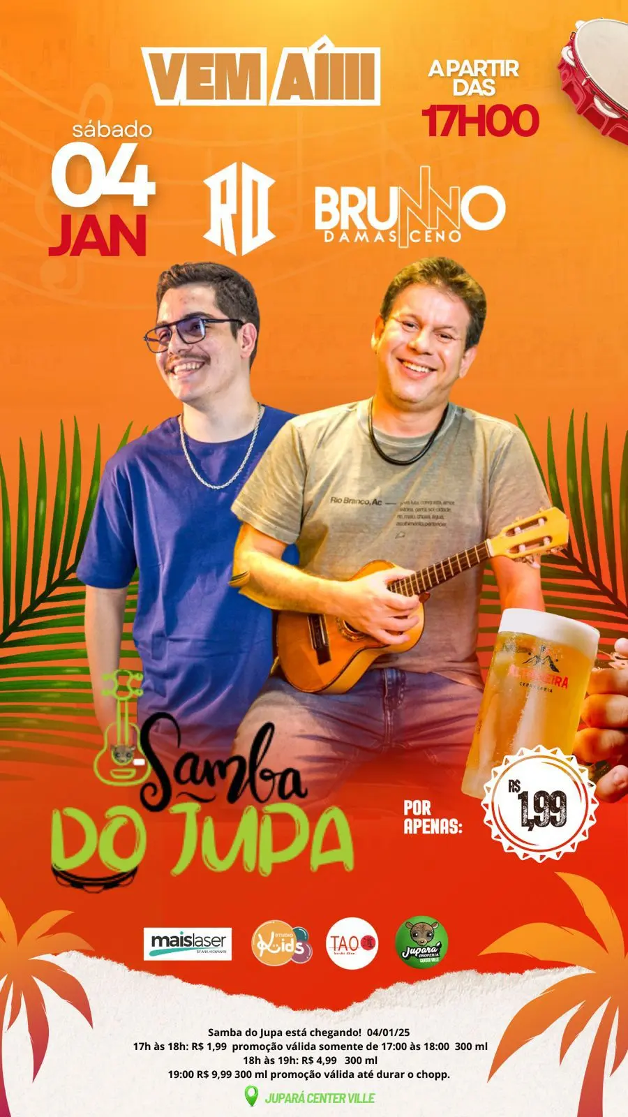 Dia 04 de janeiro começa o Samba do Jupa a partir das 17h com Bruno Damasceno e o melhor das 17h às 18h o chope geladinho por apenas R$ 1,99!