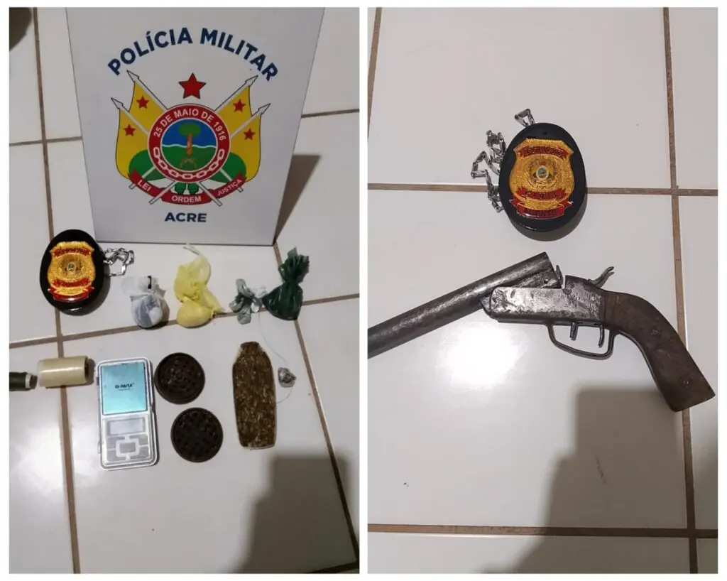Arma do crime, uma escopeta calibre 28, e drogas apreendidas na residência do adolescente suspeito durante diligências da Polícia Civil/Foto: Reprodução