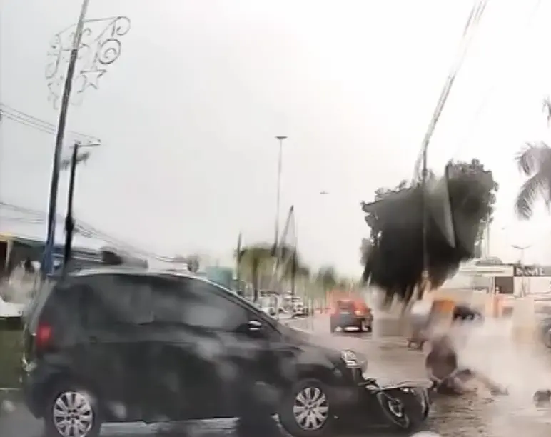 Um vídeo que circula nas redes sociais mostra o momento do acontecimento, que ocorreu durante as fortes chuvas desta sexta.