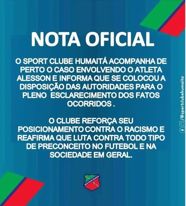 Por sua vez, o Humaitá-AC informou, na manhã desta quinta-feira, que está à disposição das autoridades para colaborar no esclarecimento do caso. O clube também reforçou seu posicionamento contra o racismo e reiterou sua luta contra qualquer tipo de preconceito no futebol e na sociedade.