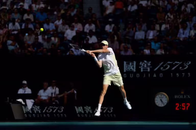 Sinner sai do chão em ponto na partida contra Rune — Foto: Darrian Traynor/Getty Images