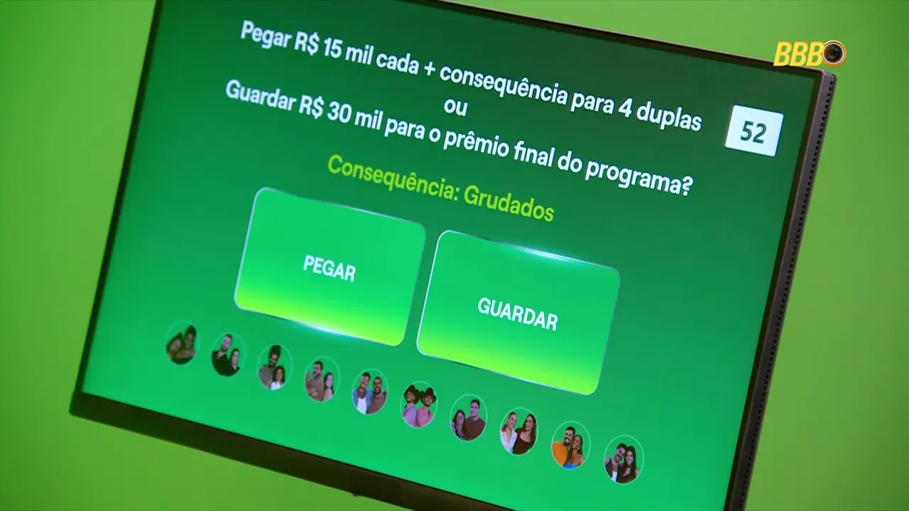 Na dinâmica “Pegar ou Guardar”, Gracyanne e Giovanna enfrentaram uma decisão desafiadora: pegar R$ 15 mil cada uma e impor consequências para quatro duplas ou guardar R$ 30 mil para o prêmio final do programa.