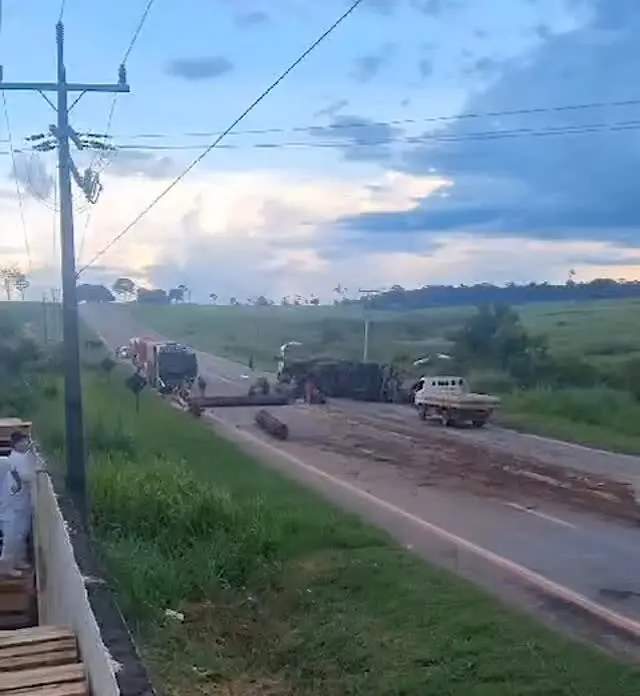 Um caminhão carregado de toras tombou nesta segunda-feira (27) na rodovia que liga Rio Branco a Senador Guiomard, no interior do Acre. O acidente aconteceu próximo a um frigorífico localizado na área que dá acesso ao município de Quinari.