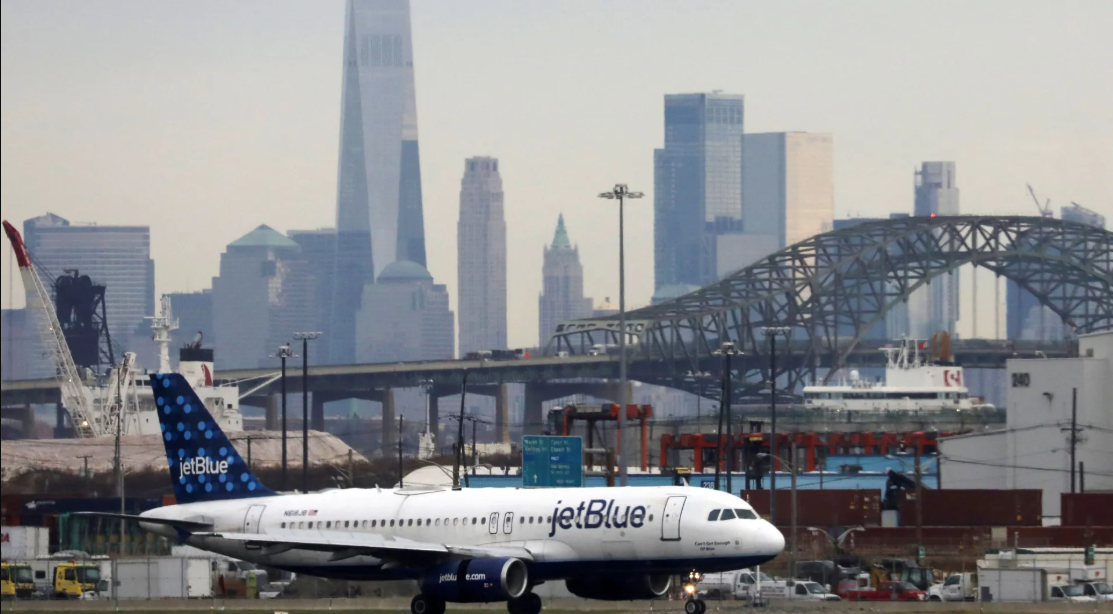 Avião da JetBlue pousa em aeroporto de Nova Jersey, com a cidade e Nova York ao fundo • 06/12/2019REUTERS/Chris Helgren