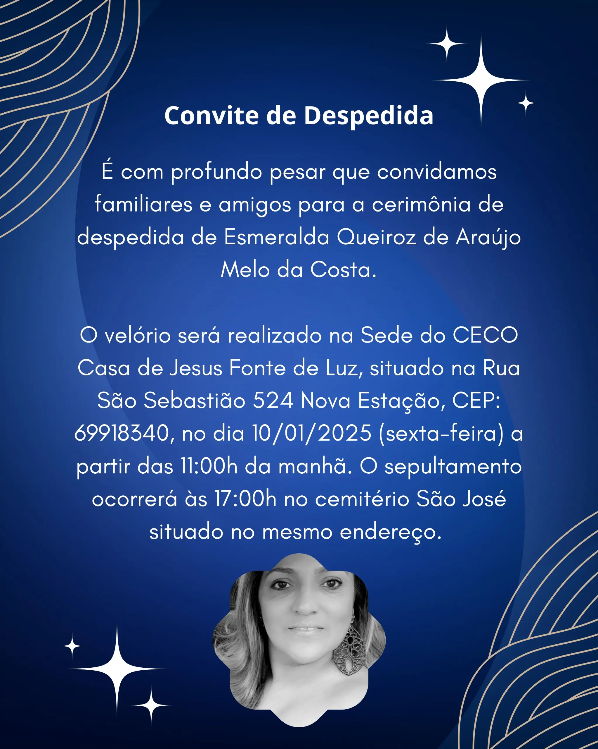 A comunidade, amigos e familiares são convidados a prestar sua última homenagem a Esmeralda, lembrada por sua dedicação à família e ao trabalho. O local e o horário do velório foram divulgados pela família através de um convite formal.