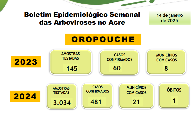 O novo boletim epidemiológico da Secretaria de Estado de Saúde (Sesacre) mostra que, em um ano, o número de casos de Oropouche cresceu mais de 700%.