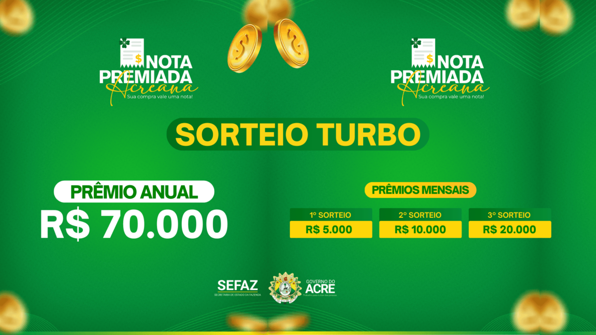 Cadastrados no programa do governo do Estado Nota Premiada Acreana participam nesta quarta-feira, 22, do sorteio turbo (anual e mensal), podendo levar uma nota para casa, com prêmios de até R$ 70 mil.