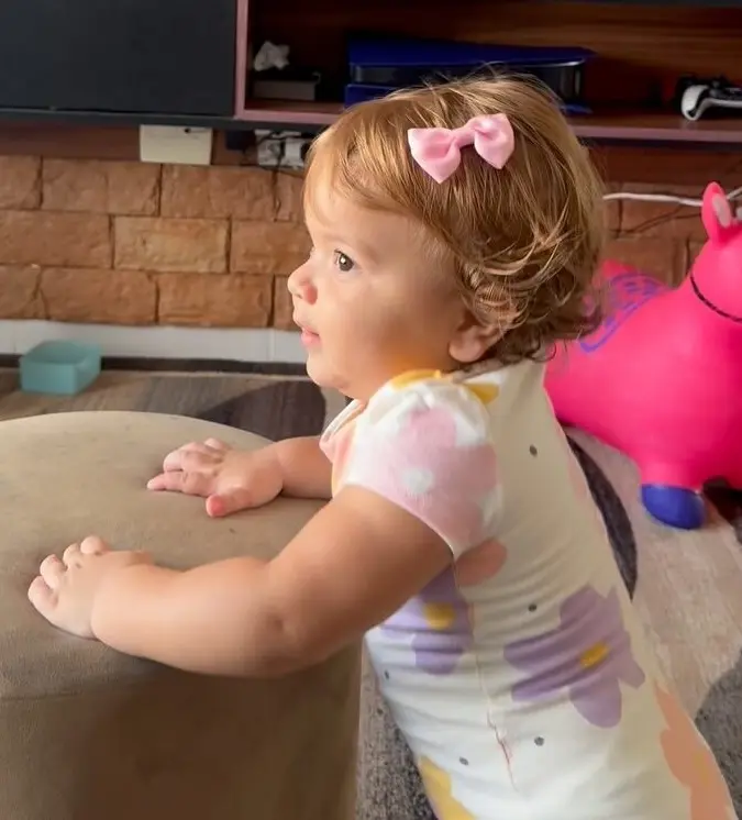 O cantor acreano Matheus Lira divulgou um momento de fofura envolvendo sua filha, Jasmin, que tem pouco mais de um ano de idade, assistindo ao pai pela televisão, enquanto dança.