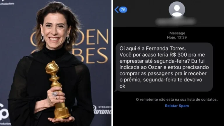 âOi, aqui Ă© a Fernanda Torres. Por um acaso teria R$ 300,00 pra me emprestar atĂ© segunda-feira? Eu fui indicada ao Oscar e estou precisando comprar as passagens para ir receber o prĂȘmio. Segunda-feira te devolvo, ok?â, dizia o SMS.