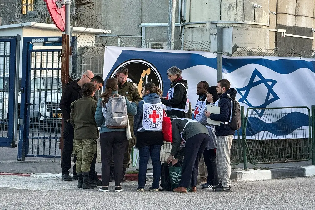 Soldados israelenses e membros da Cruz Vermelha se reúnem perto da prisão militar israelense, Ofer, no dia em que Israel libera prisioneiros palestinos como parte de uma troca de reféns-prisioneiros e de um acordo de cessar-fogo em Gaza entre Hamas e Israel, próximo a Ramallah, na Cisjordânia ocupada por Israel/Foto: Reprodução