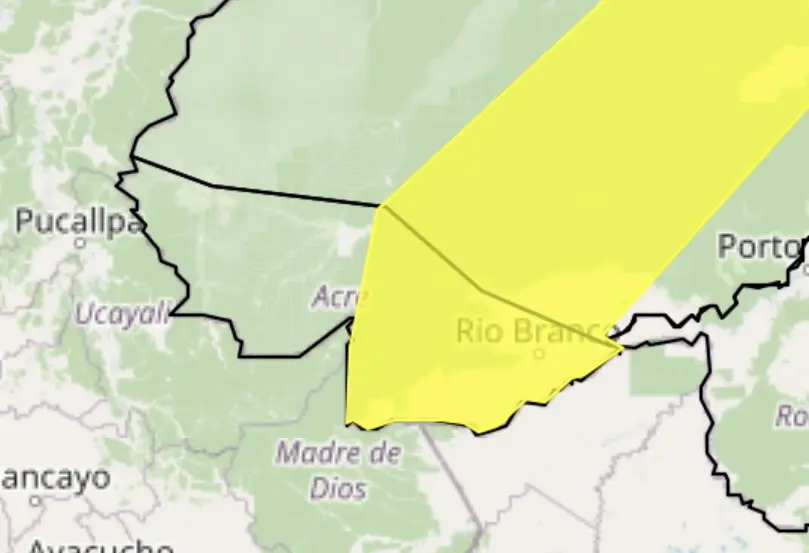 O Instituto Nacional de Meteorologia (Inmet) emitiu um alerta de nível amarelo, neste domingo (19), que atingirá parte do estado do Acre. As chuvas devem ficar entre 20 e 30 mm/h, ou até 50 mm/dia, com ventos intensos entre 40 e 60 km/h.
