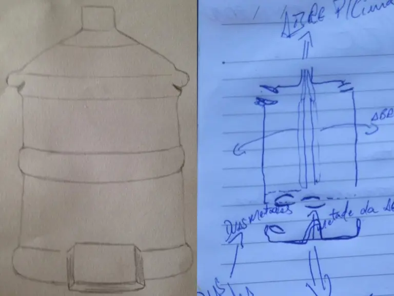 Assim que Francisco Moka retornou do sacrifício, suado e cansado, Evandro Damasceno pediu ao amigo uma caneta e um pedaço de papel. “Ele me deu um pedaço de papel daqueles usados como embalagem de cigarro, que permitem que a gente escreva e rabisque com facilidade na parte interna. Comecei a desenhar o que eu entendia ser útil e funcional para adaptar às embalagens de água mineral no futuro”, revelou.