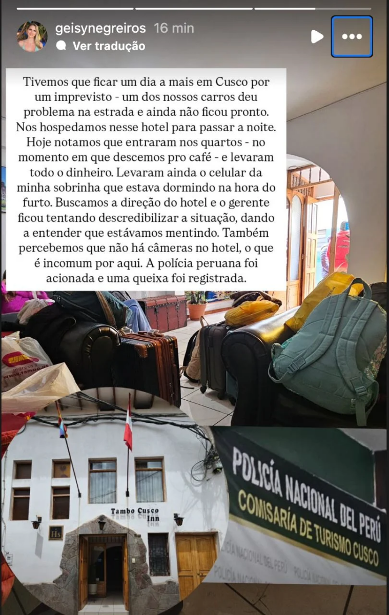 A jornalista Geisy Negreiros, do Grupo Rede Amazônica, filiado a Rede Globo no Acre, expôs em suas redes, nesta quarta-feira (22), um contratempo enfrentado em solo peruano. De acordo com o relato, o quarto do hotel de onde estava hospedada a família foi invadido.
