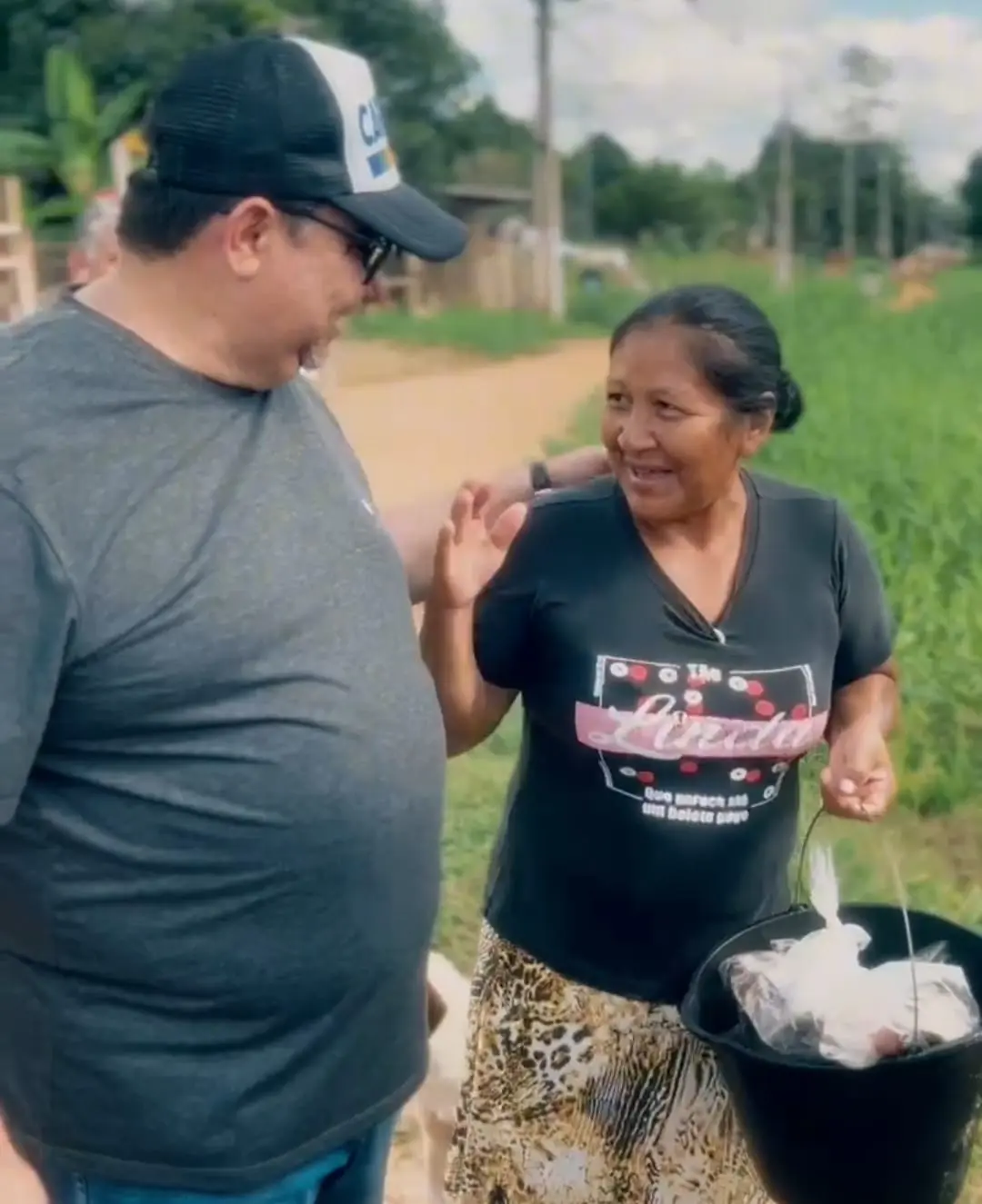 De repente, ouviu-se uma voz surpreendente e emocionante que vinha de uma idosa do povo Jaminawá na comunidade: “Nós não tínhamos mistura, só arroz.” Concluiu ela com um leve sorriso tímido no rosto, agradecendo ao prefeito pelo gesto carinhoso.