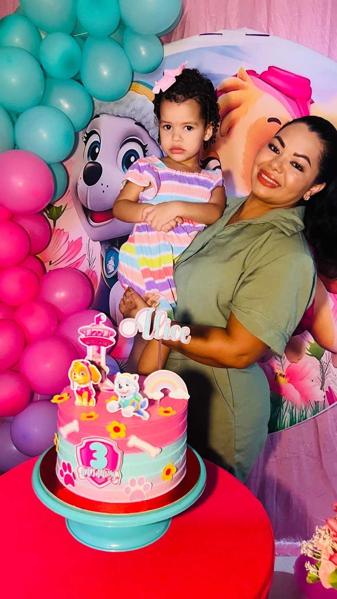 A pequena Alice completou três aninhos na segunda-feira (27) ganhando uma linda festa com o tema Patrulha Canina. Na foto Alice com a vó Flory Araújo.