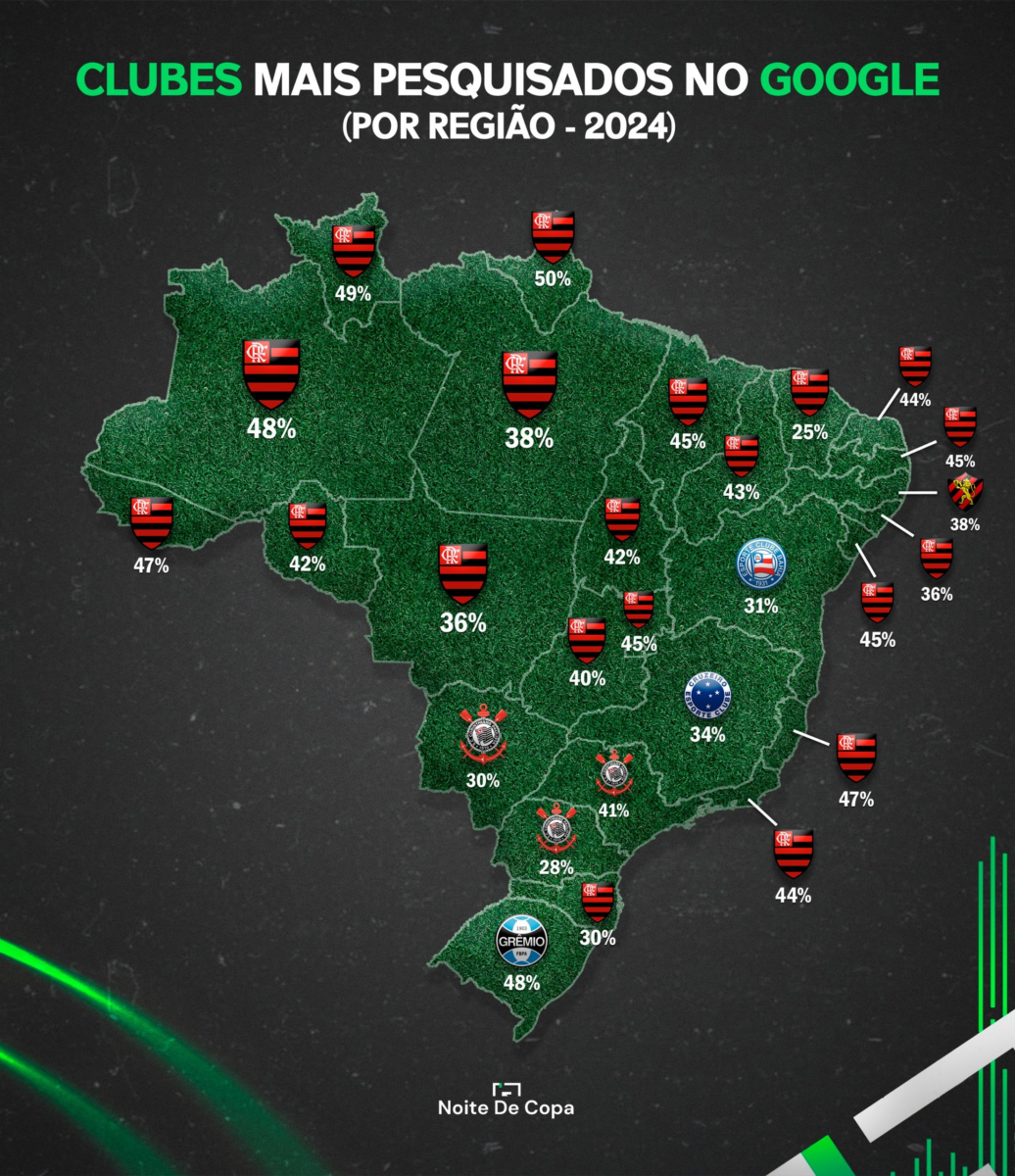 Um levantamento realizado pelo perfil Noite de Copa, com dados da plataforma do Google Trends, aponta os cinco clubes de futebol mais pesquisados em cada estado do Brasil.