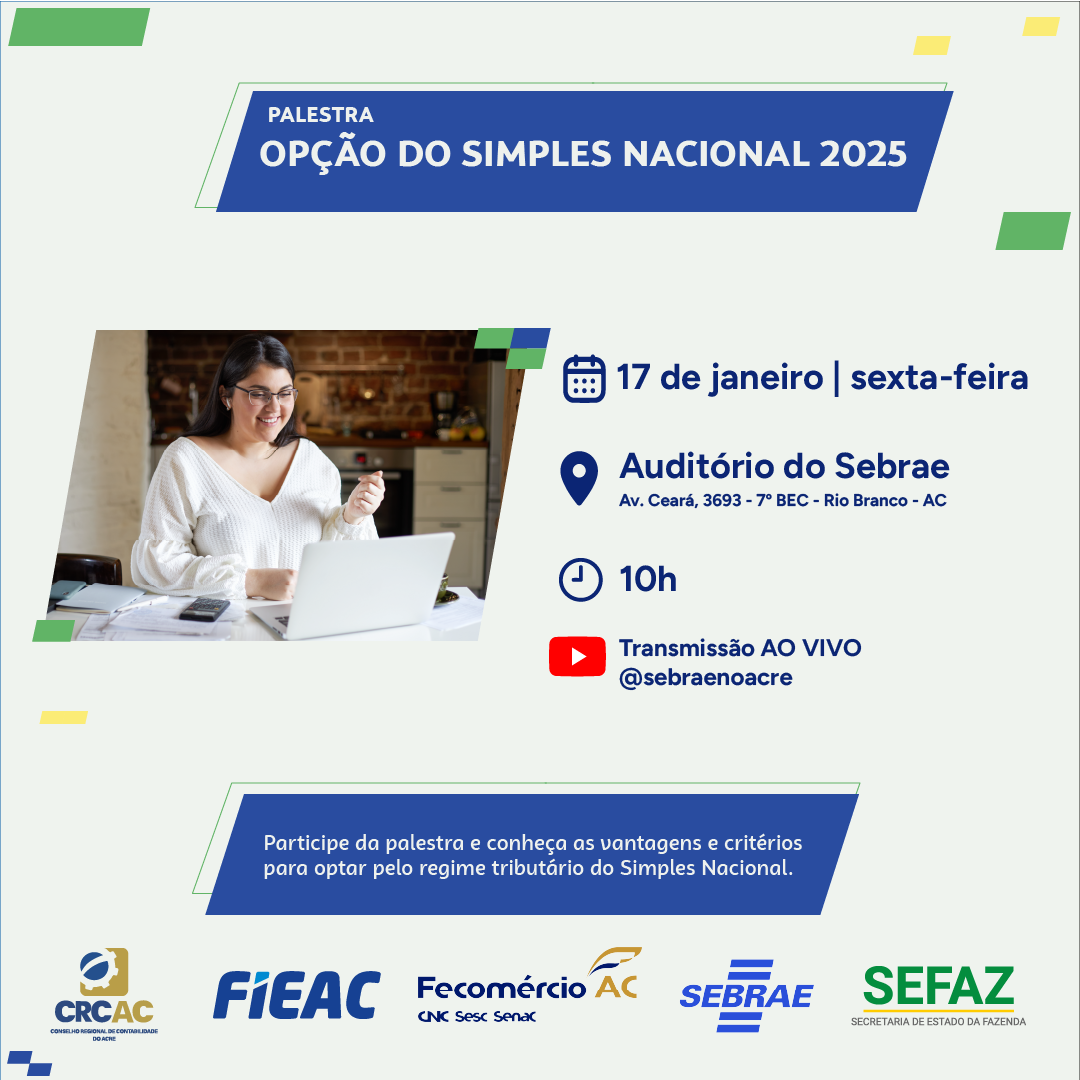 Para ajudar os empreendedores do Acre a entenderem o Simples Nacional, a Secretaria de Estado da Fazenda, o Sebrae no Acre, o Conselho Regional de Contabilidade (CRC/AC), a Fecomércio e a Fieac vão realizar a palestra “Opção do Simples Nacional 2025” nesta sexta-feira (17), às 10h, na sede do Sebrae, em Rio Branco.