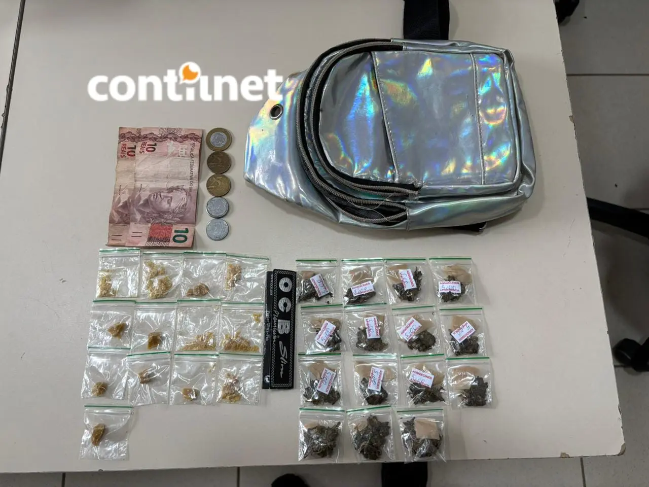 Ao realizar a abordagem, os policiais avistaram uma bolsa prateada no interior do apartamento, contendo diversos pacotes com substâncias suspeitas.