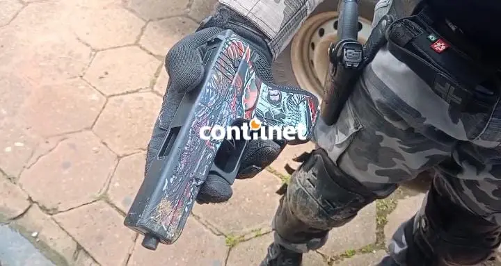 Durante a revista pessoal, o passageiro da moto, identificado como Isaque, portava um simulacro (arma de brinquedo) tipo pistola, modelo Glock, na cintura e resistiu à prisão, sendo necessário o uso de força moderada para contê-lo. Vale ressaltar que Isaque possui passagem por roubo.