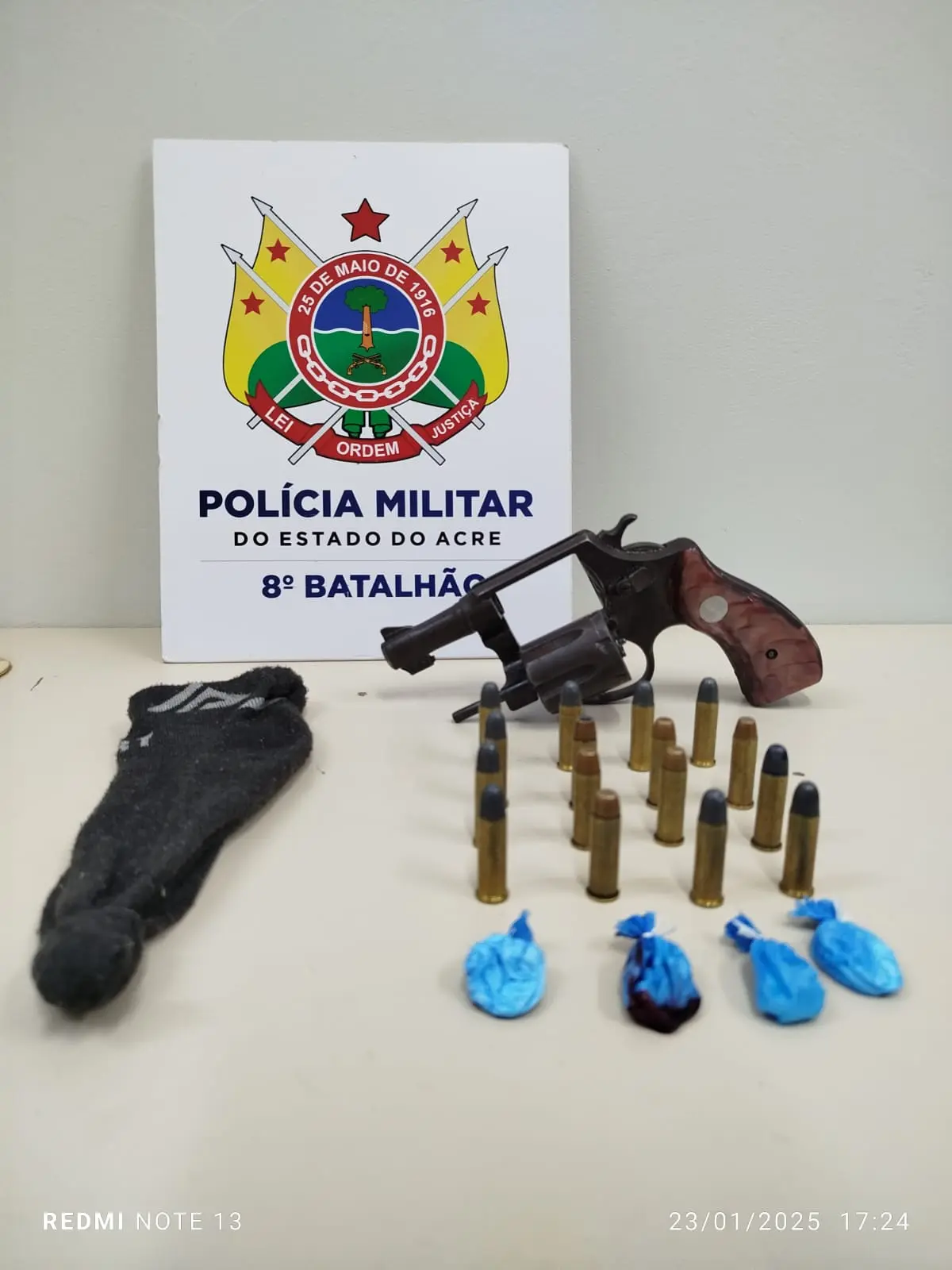 Em determinado momento, os militares avistaram os dois que saíram correndo em disparada, verificou-se que J. S. A, apontado como liderança de facção, adentrou na casa de seus pais portando um objeto aparentando ser arma de fogo. Após conversa com o dono da casa, ele permitiu a entrada dos PMs. No local, foi encontrado um revólver calibre 38, de numeração 600931, com 16 balas do mesmo calibre intactas. Além disso, dentro do vaso sanitário foram encontradas 04 trouxinhas de cocaína.