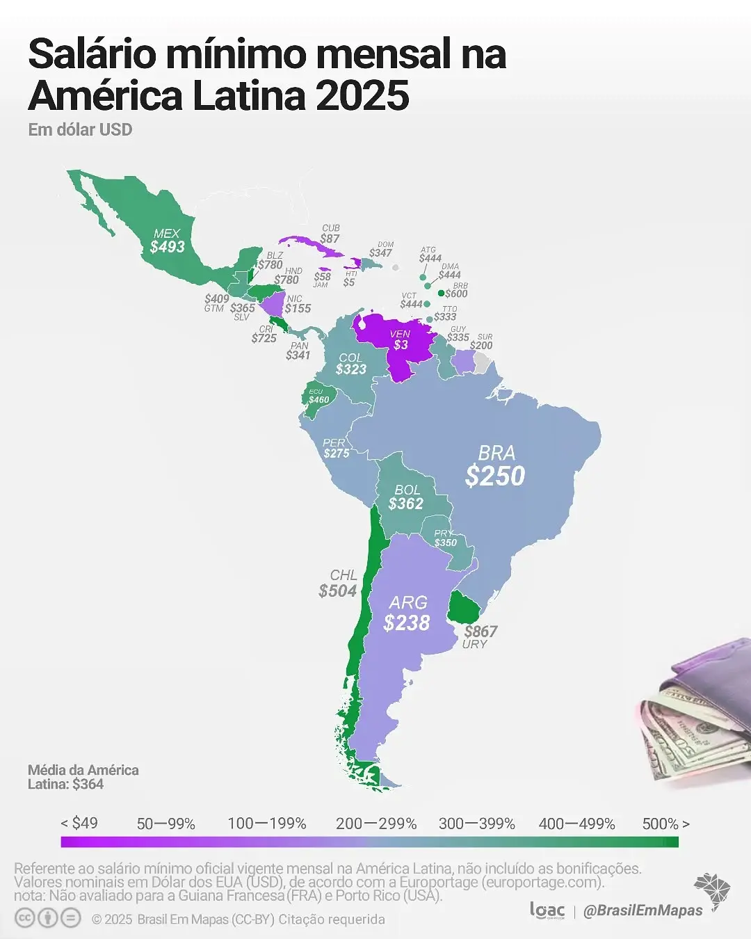 Em 2025, o salário mínimo do Brasil permanece abaixo da média regional da América Latina, o que levanta questões sobre o poder de compra e a qualidade de vida de seus cidadãos.