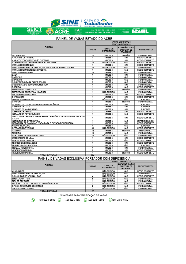 O Sistema Nacional de Emprego do Acre (Sine) está disponibilizando, nesta segunda-feira (27), um total de 241 vagas de emprego para diversas áreas na capital, Rio Branco.
