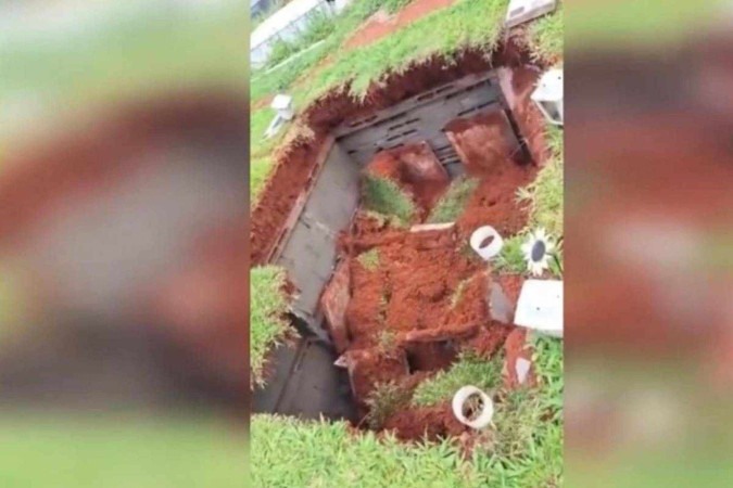Parte do solo do Cemitério Campo da Esperança cedeu na tarde de ontem (19/1), deixando três túmulos expostos. O fato foi gravado por uma pessoa que passava próximo ao local.