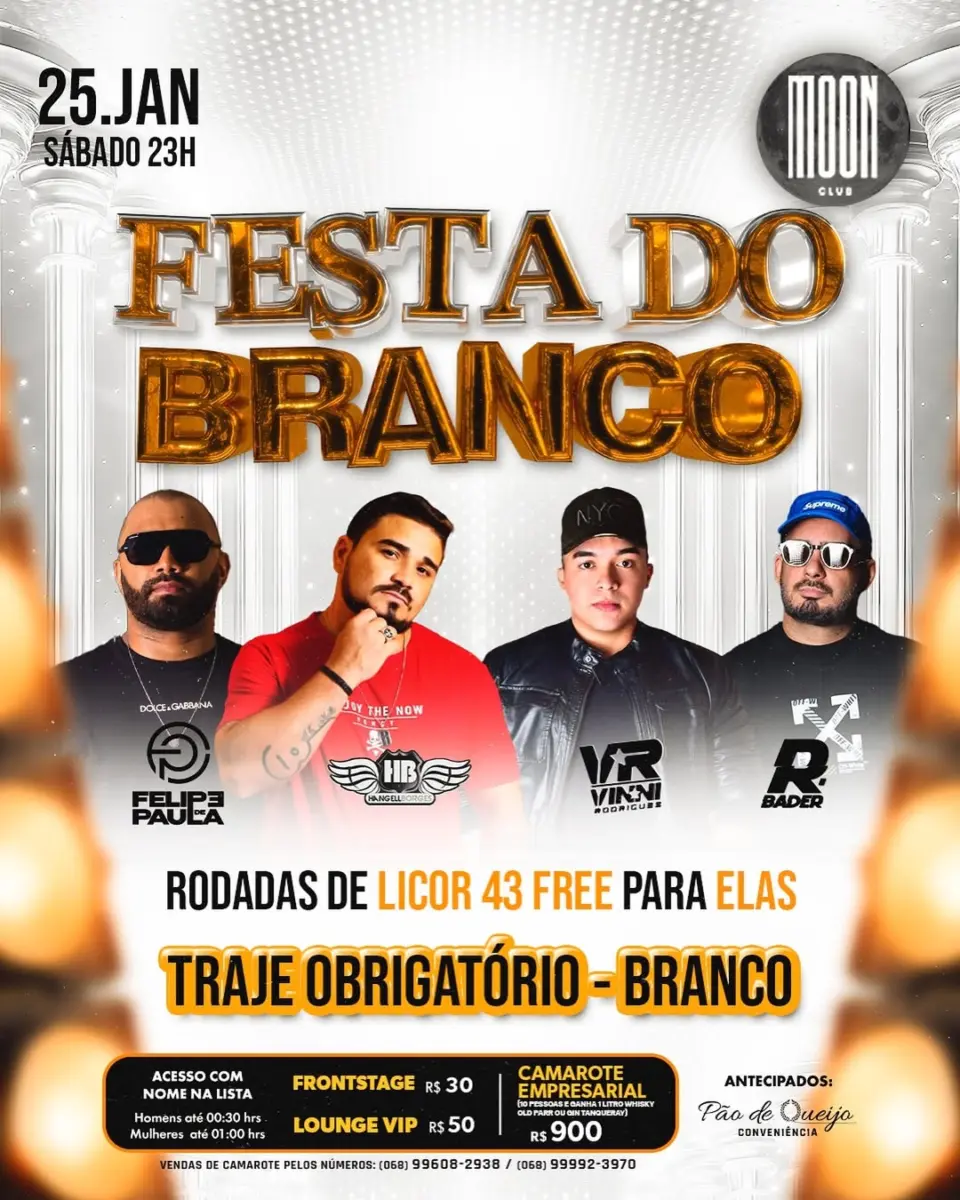 O sabadão não perdeu o ritmo da sexta-feira e segue recheado de atrações, começando pela Moon, que trás a festa do branco, pra você se sentir em uma festa de ano novo, porque é regra é essa, todo mundo vestido de branco pra aproveitar o show de luzes da casa!