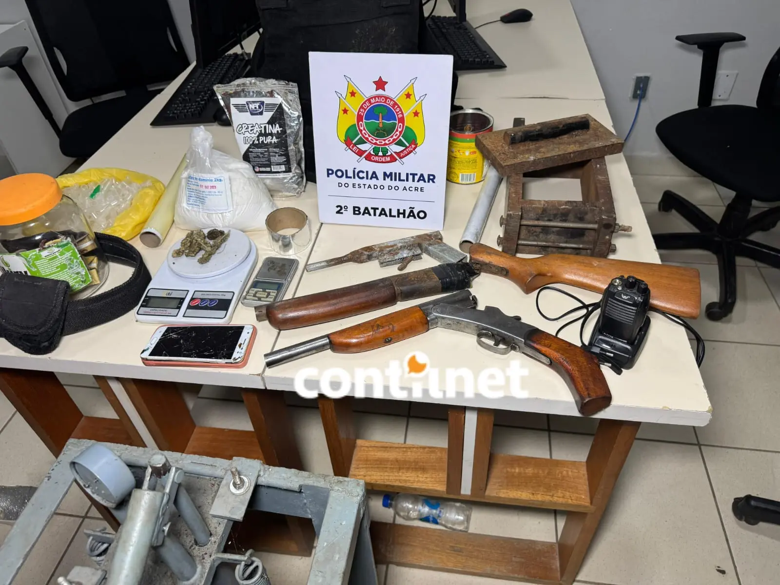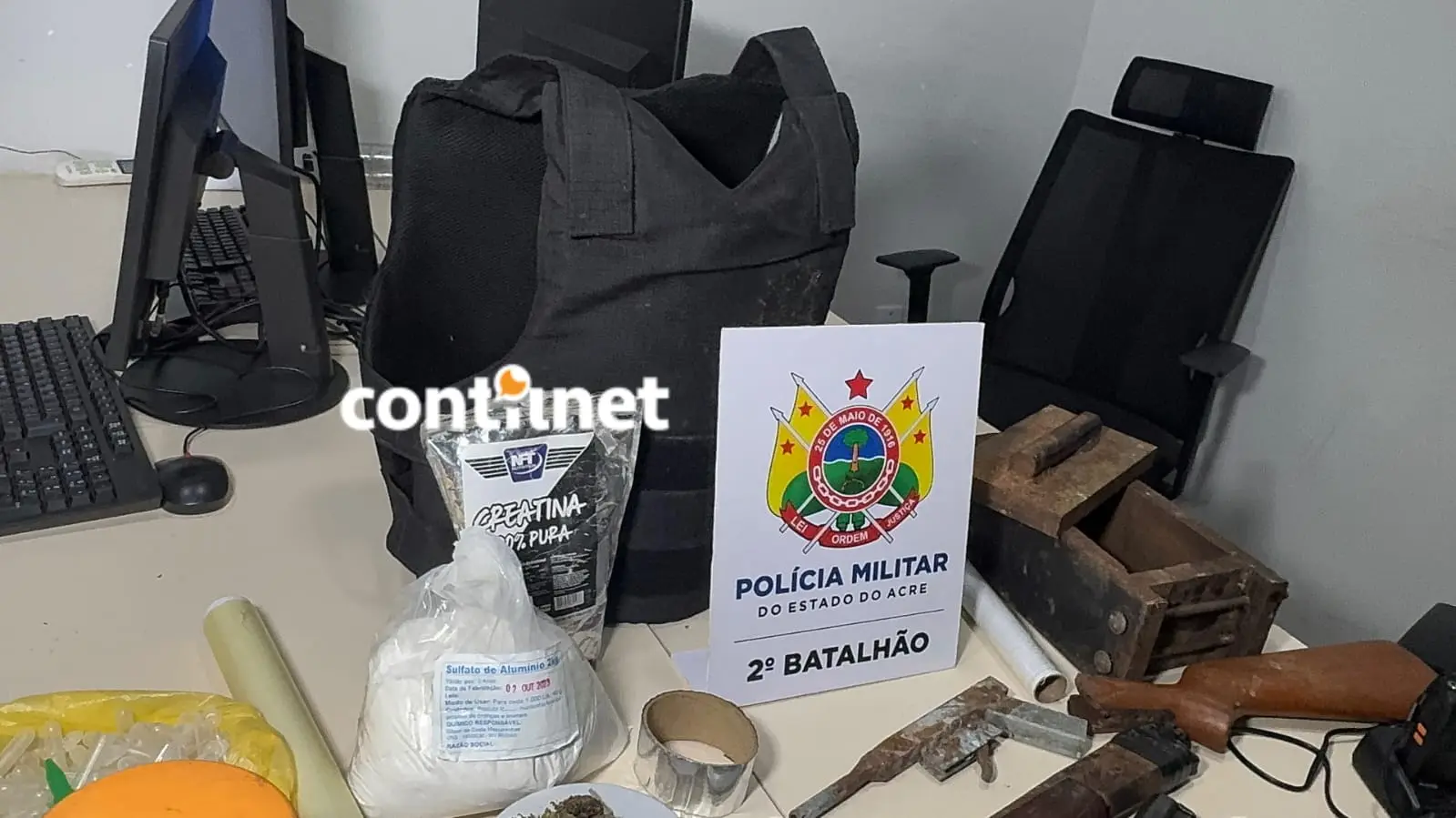 Após buscas no local, os policiais encontraram uma arma calibre 28, municiada, uma sacola com pinos plásticos vazios usados para embalar cocaína, e outras armas: uma espingarda calibre 12 e uma calibre 22. Também foram apreendidos um colete balístico do Tribunal de Justiça do Acre, um rádio comunicador com carregador, duas balanças de precisão, uma prensa hidráulica e outros materiais utilizados para o preparo e a comercialização de entorpecentes.