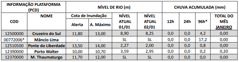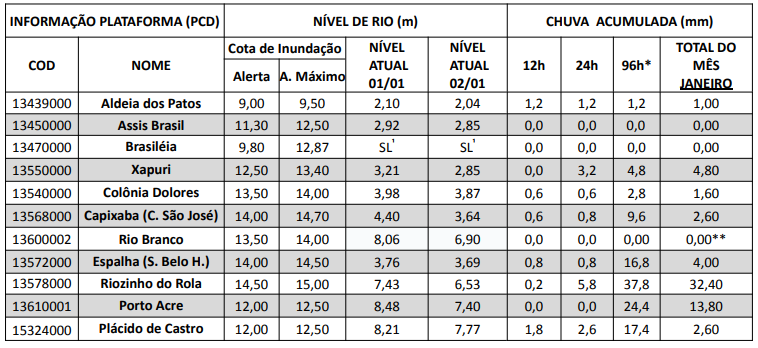 O Rio Acre, na capital, saiu de 8,06 m para 6,90 m. O mesmo aconteceu com o Riozinho do Rola, que desceu de 7,43 m para 6,53 m.