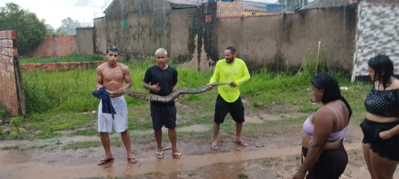 Moradores do bairro Canaã, na Rua Arnaldo Aleixo, registraram a captura de uma jiboia de cerca de três metros durante a forte chuva que atingiu algumas regiões de Rio Branco na tarde desta segunda-feira (27).