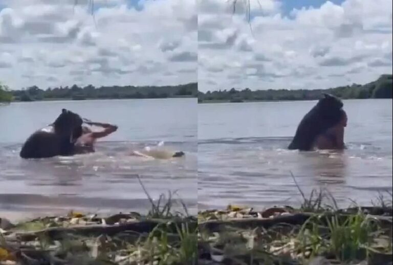 Nas imagens, a adolescente aparece inicialmente brincando com o animal dentro da água. No entanto, a situação muda repentinamente quando ele avança contra ela, empurrando-a para dentro do lago. Ela se desespera e tenta fugir da situação.