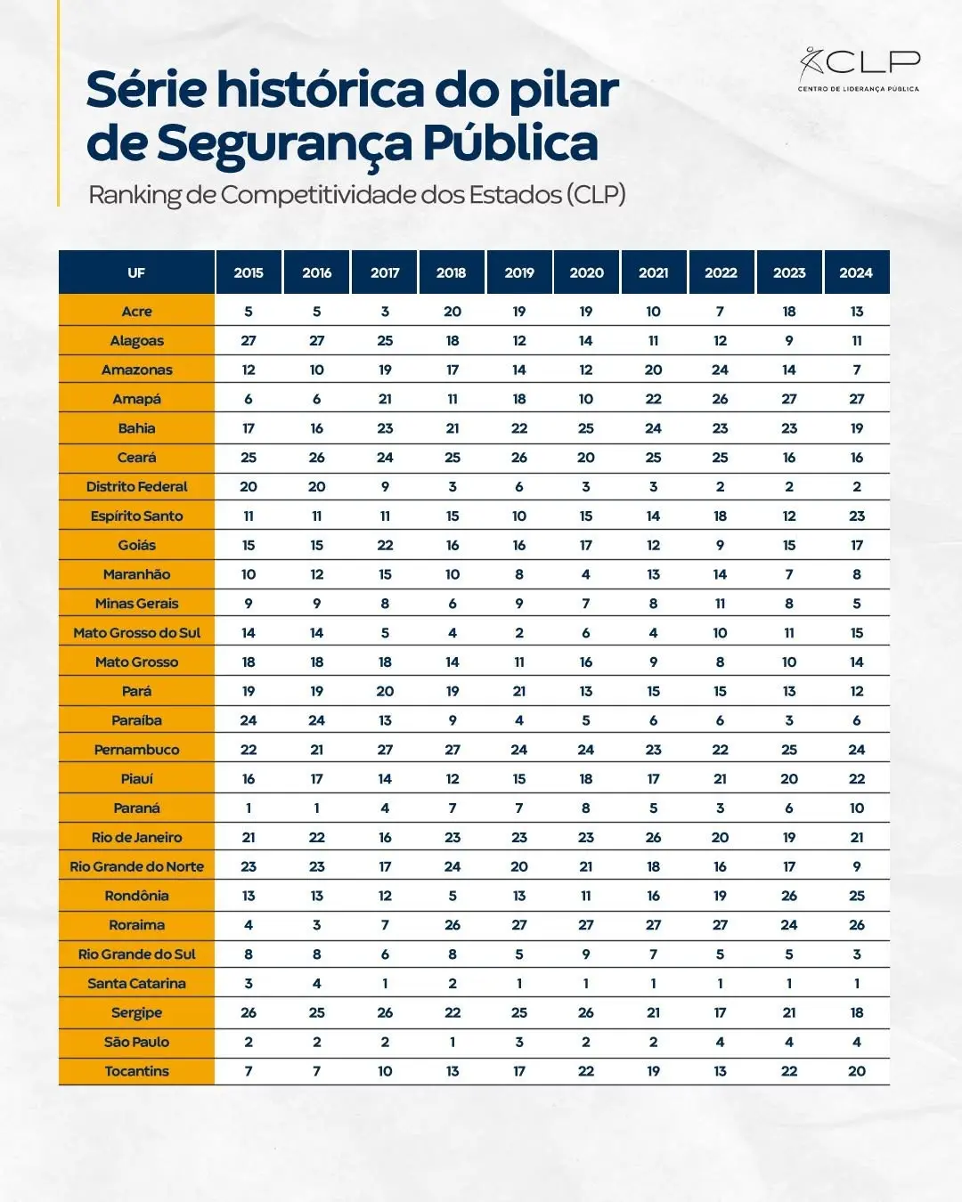 Segundo a CLP os dois estados que apresentam a melhor segurança pública do país são Santa Catarina (1° lugar) e Rio Grande do Sul (3°). O Distrito Federal ocupa a 2° posição. Os estado que assumem as piores posições são Rondônia (25°), Roraima (26°) e Amapá (27°).