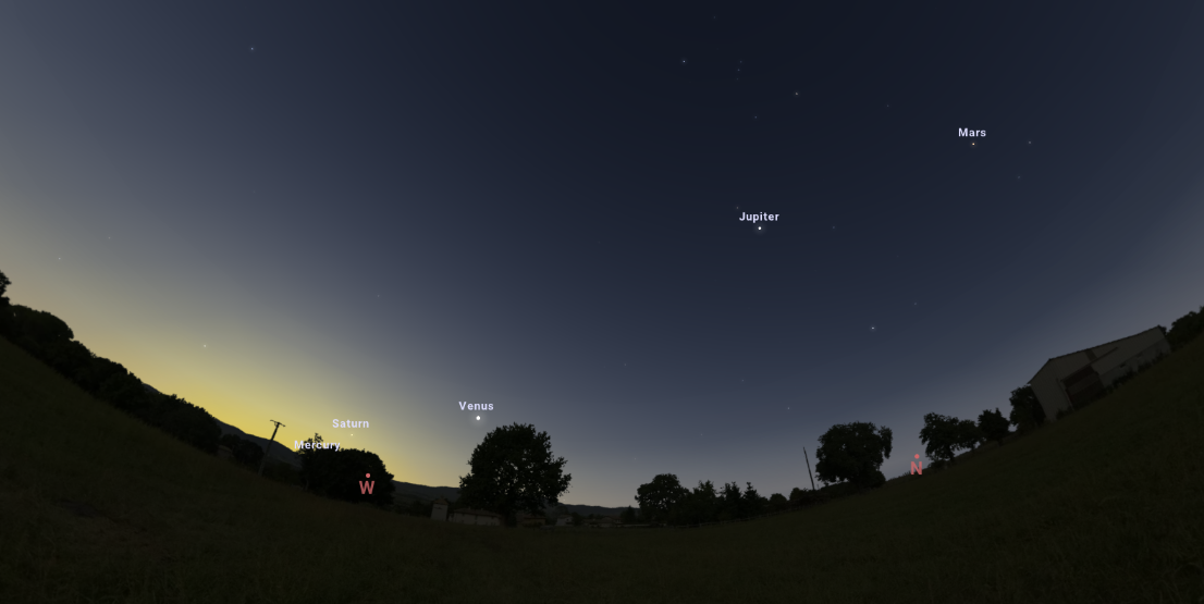 Vênus é o ponto mais brilhante próximo ao horizonte na direção oeste. Saturno também aparece próximo a ele, nesta direção, mas com menos brilho.