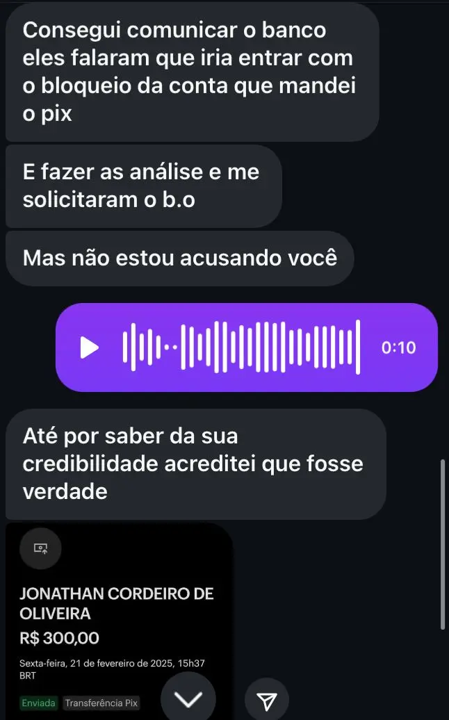 Com o controle das contas, os criminosos começaram a enganar seguidores de Kely, solicitando dinheiro e promovendo falsas campanhas. “Infelizmente, uma pessoa já caiu e depositou R$ 300,00”, lamentou.