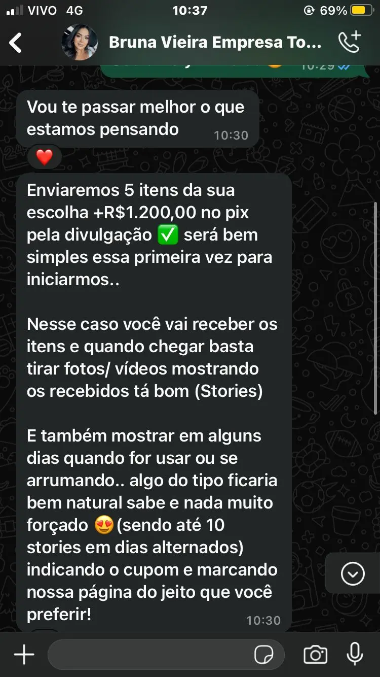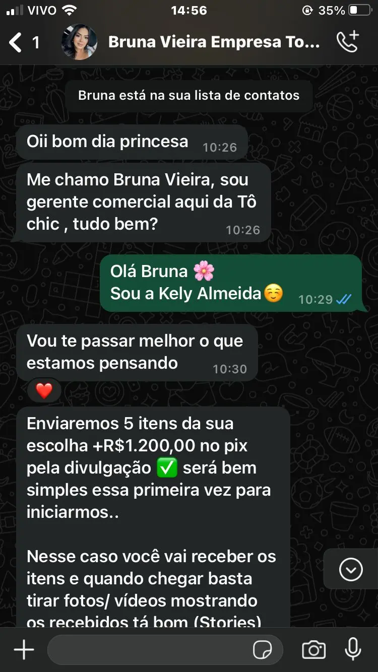 Kely recebeu uma mensagem no Instagram de uma pessoa que se identificava como Bruna Vieira, gerente comercial de uma loja chamada “Tô Chic”. A proposta envolvia o envio de cinco peças de roupa e um pagamento de R$ 1.200,00 via Pix em troca de postagens em suas redes sociais.