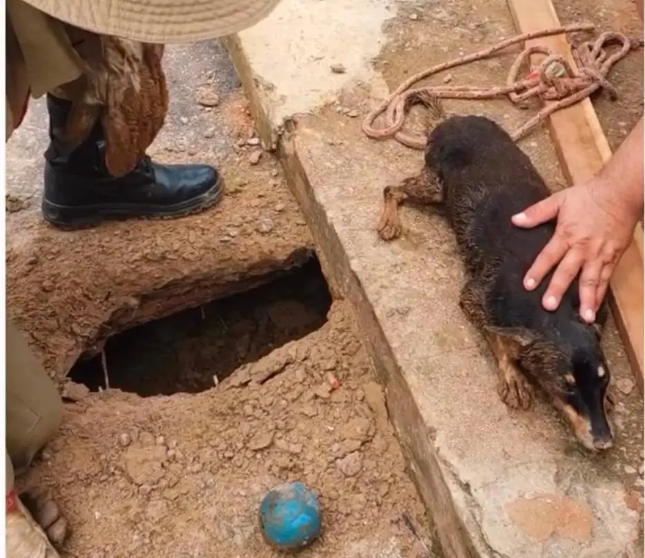Nas imagens, é possível ver o exato momento em que um dos agentes consegue puxar o animal, que está encharcado de lama. Pipoca foi resgatada sem ferimentos e entregue à família.