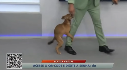 Enquanto o jornalista comandava a atração, um cachorro caramelo invadiu o estúdio e tentou cruzar com sua perna.