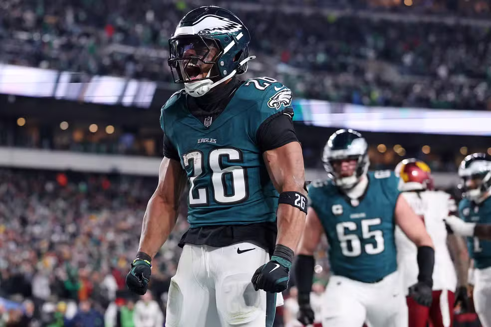 Saquon Barkley (26) comemora um de seus três touchdowns pelo Philadelphia Eagles na final da NFC — Foto: USA TODAY Sports via Reuters Connect